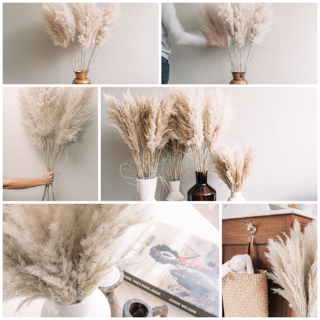 - Begin met het kiezen van een kleurenschema. Pampas pluimen zijn er in allerlei kleuren, dus u kunt de perfecte match vinden voor uw huisinrichting. Bij Blooming Gift vindt u een neutrale witte kleur. Het grootste voordeel van witte pampasgrassen is dat ze bij elke inrichting passen.